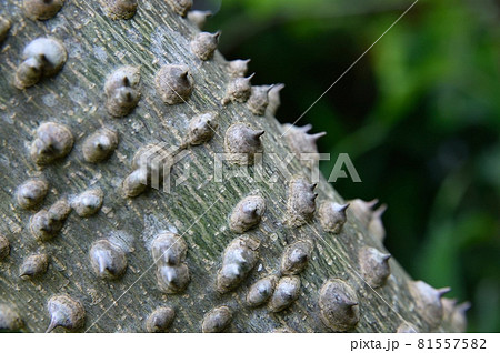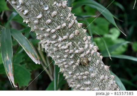 カラスザンショウの樹皮をクローズアップ トゲは古くなると落ちる