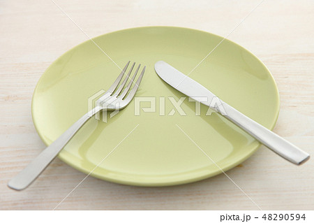 白い木製テーブルに置かれた緑の皿とカトラリーの休止の合図