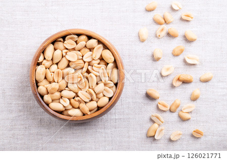 Roasted peanuts in a wooden bowl on linen fabric. Ready-to-eat crunchy snack food made from fruits of Arachis hypogaea. Light golden snack nuts with natural, nutty aroma, and firm, crunchy texture.
