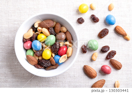 Rainbow trail mix in a white bowl on linen fabric. A snack mix of candy coated milk chocolate peanuts, roasted peanuts, raisins, and roasted almonds. A combination of sweets, dried fruits, and nuts.