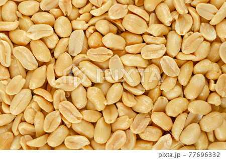 Roasted and salted peanuts, background, from above. Snack food, made from fruits of Arachis hypogaea, also groundnut, goober, pindar or monkey nut, with high oil content. Backdrop. Macro food photo.
