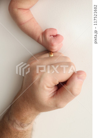 Dad and newborn baby boy son keep their hands in a fist, small and big fists. Father and son, the first boxing punch.