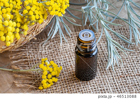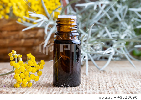 A bottle of helichrysum essential oil with fresh
