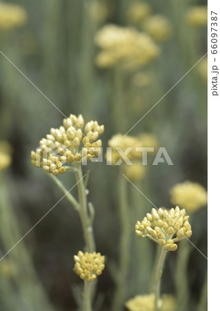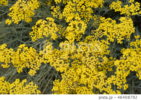 Helichrysum stoechas shrub with yellow flowers.