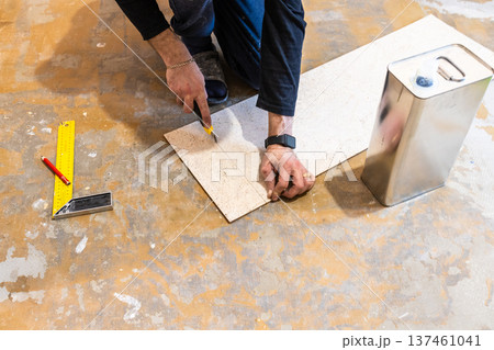 Installation of ceramic tile on floor in flat in building under construction.