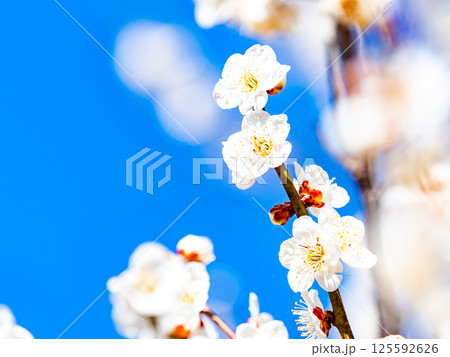 春の訪れを告げる満開の清楚な白梅 青空を背景に