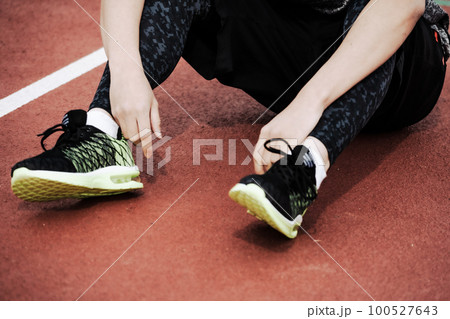 陸上競技場のトラックで座りこむフィニッシュ後のランナー
