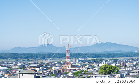初夏の青空と山並みを背景に映える都市景観・温泉街スポット菊池市街地風景 (菊池市)(菊池公園)