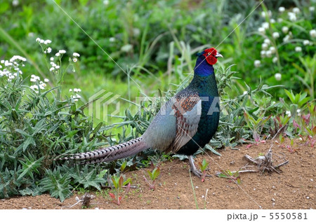伊豆の庭に舞い降りた美しく光り輝くオスのニホンキジ