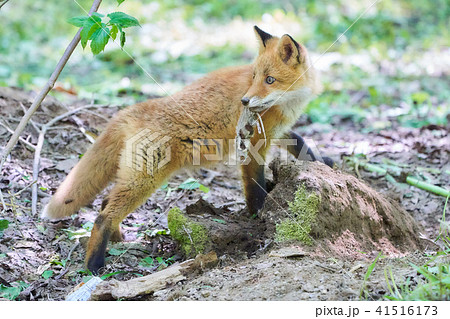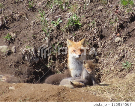 巣から出てきたキタキツネの幼獣(北海道・鶴居村)
