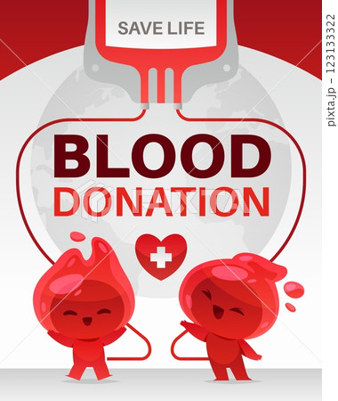 Cartoon blood drops characters. Donation and transfusion, smiling red mascots, medical symbols, funny liquid creatures, clinic poster template, cartoon flat isolated tidy vector concept
