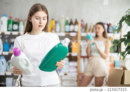 Young girl buyer chooses detergent in store