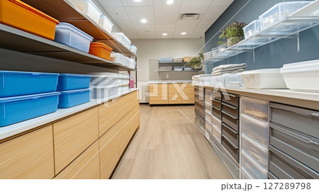 Organized Storage Units with Plastic Bins and Wooden Cabinets