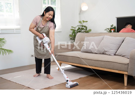 Young modern Asian woman doing house cleaning at home. Confident and independent homemaker maintaining a clean, stylish living space.