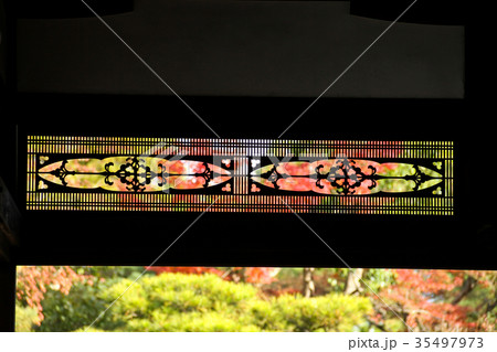 龍安寺の秋、勅使門の欄間の透かし彫りから漏れる秋色の外光