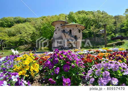 快晴の春、飯能市あけぼの子どもの森公園、新緑芽生える加治丘陵と、きのこの家をバックにパンジーの花壇を