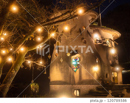 あけぼの子どもの森公園、夜を迎え、きのこの家に明かりが灯(とも)る
