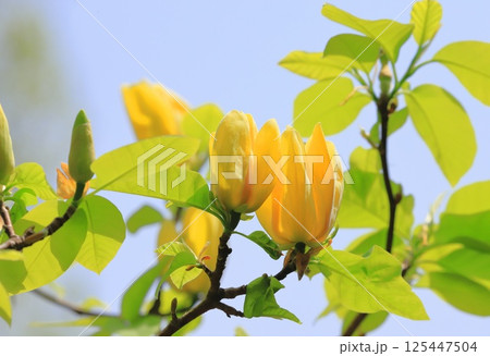 青空に咲く黄花木蓮(キバナモクレン)の花