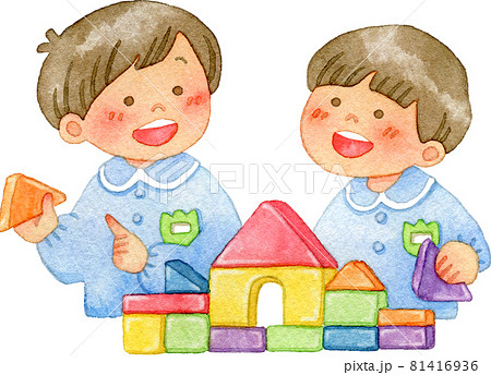 積み木で遊ぶ子供の水彩イラスト(園児)