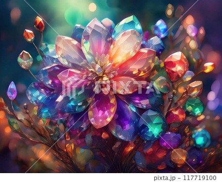 色とりどりの宝石でできた光り輝く透明感のある花のイラスト