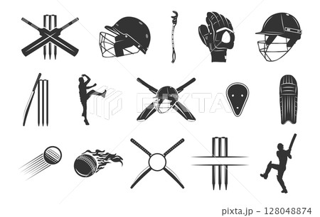 Cricket silhouette, Cricket bat, ball, stump player silhouette, Cricket silhouette bundle, Cricket svg, Cricket sports equipment silhouette.