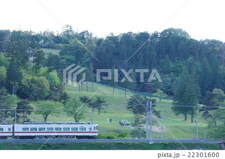 緑のゴルフ場を横切る東武日光線の臨時特急きりふり号