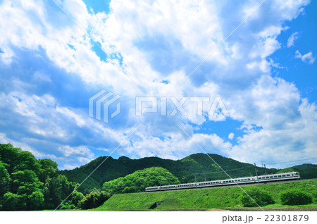 新緑の築堤を走る東武日光線臨時特急きりふり号