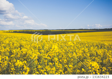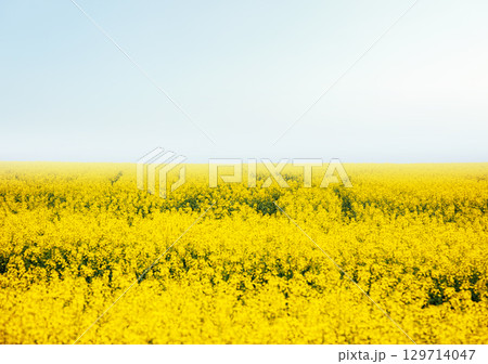 Fields with rapeseed on a foggy day. Agricultural fields.