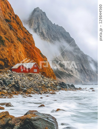 Red Coastal House Dramatic Mountain Foggy Ocean Rocks Scenic View sea sky day home wild cold gray