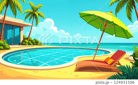 Cartoon summer beach. Paradise nature vacation, ocean or sea seashore. Seaside landscape, tropical beach relax or seaside landscape. Vector background illustration