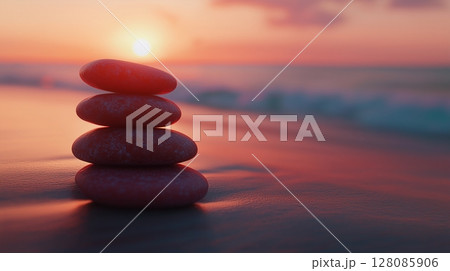 Stack balance Zen red stones on beach sand with sunset sky landscape view