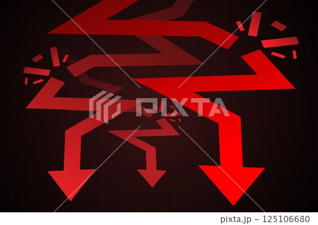 Jagged red arrows break mid-path and plunge, representing chain reaction of crisis and collapse. Vector illustration.