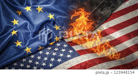 International trade conflict scene with usa and eu flags representing economic dispute in rainy urban setting