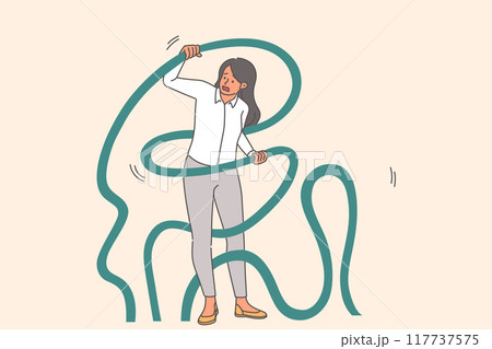 Woman is entangled in problems and troubles, and needs help to get out of binding ropes