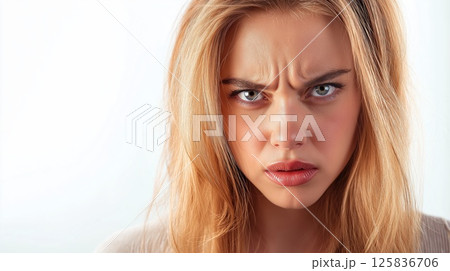 Portrait of angry blonde young woman with furrowed eyebrows showing negative emotion