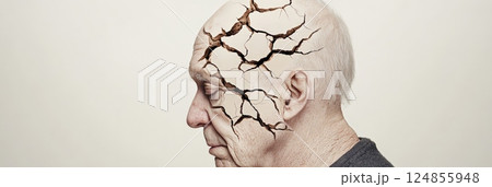 Profile of an elderly man with cracked skin on his head, symbolizing mental strain, stress, and information overload. Represents concepts like burnout, migraines, and cognitive challenges