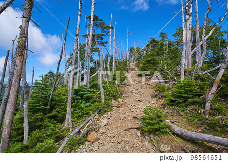 長野(山梨)の金峰山に向かう大ナギのガレ場から朝日岳方向(立ち枯れの登山道)