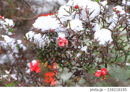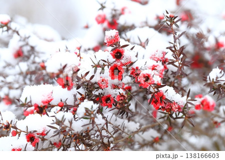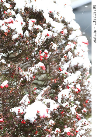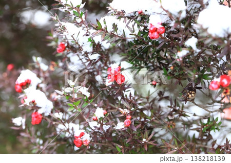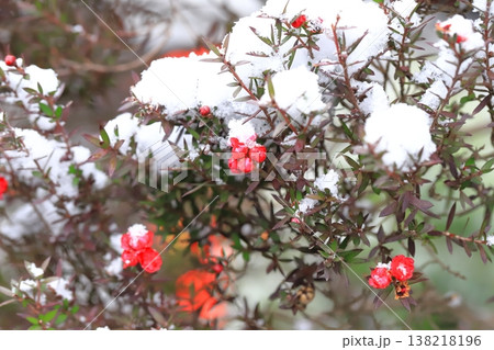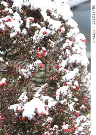 季節はずれの雪をかぶった御柳梅(ギョリュウバイ)