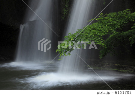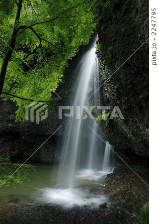 月待の滝 新緑青み渡る 裏見の滝 くぐり滝 二十三夜尊信仰