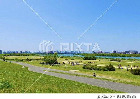 淀川河川敷公園 河川敷のトラックで子供たちがトレーニングをしている遠景 大阪市