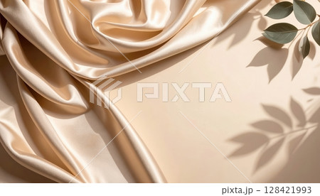 Golden silk fabric with a luxurious, smooth, and shiny texture creating a soft, rippled pattern perfect for a decorative backdrop
