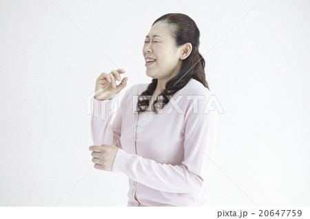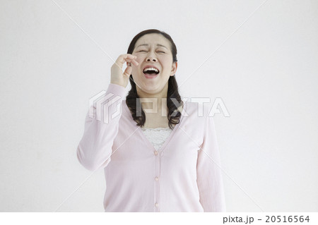 40代女性くしゃみのポーズ、号泣ポーズ、自然光白バック