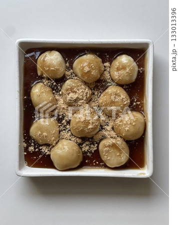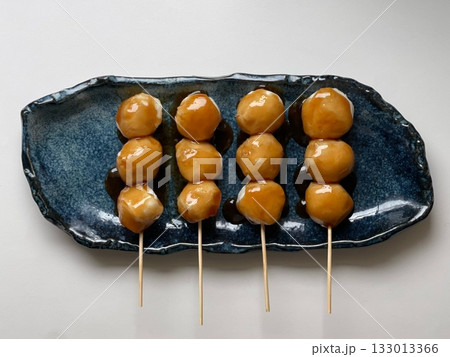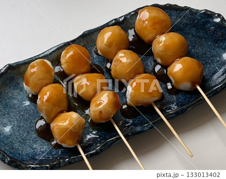 Mitarashi dango, skewered rice dumplings glazed with a sweet soy sauce syrup, offering a delightful balance of sweetness and umami. A classic Japanese snack perfect for any occasion.