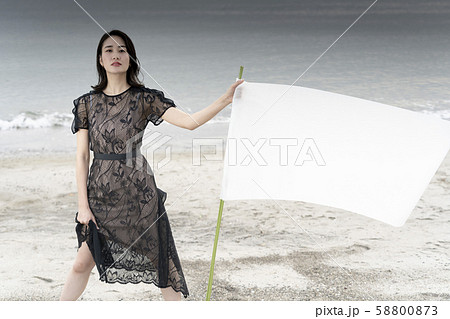 闘いに挑む目力の強い白布を持ち波打ち際に仁王立ちする女性コピースペース