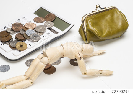 財布とお金と電卓で落ち込むデッサン人形