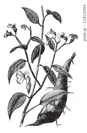 Cassava manioc plants with leaves and tuber. Vector vintage engraving