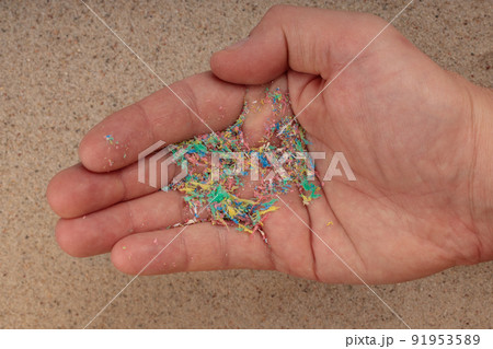 Micro-plastic on the palm of your hand, top view of the beach. Evironmental problem.