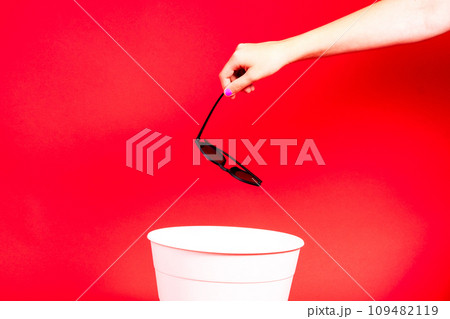 Hand throws sunglasses into trash bin with package on red background