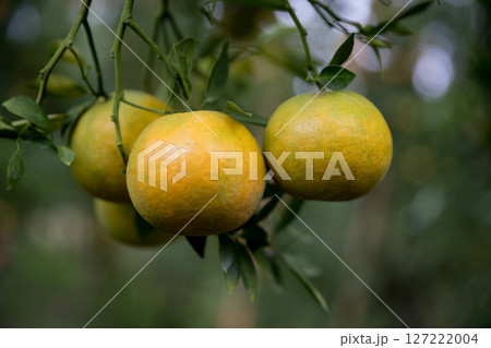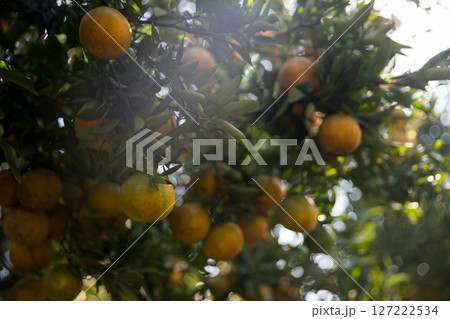 Business farm orange concept nature fruit citrus orchard mandarin tree growing, vibrant organic lush leaves background farmer green garden crop leaf ripe laden branches plant close up farming growth.