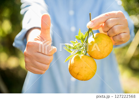 Business farm ripe orange concept farmer hand pick nature fruit citrus orchard mandarin tree growing organic lush leaves background green vibrant garden crop leaf laden branches plant close up growth